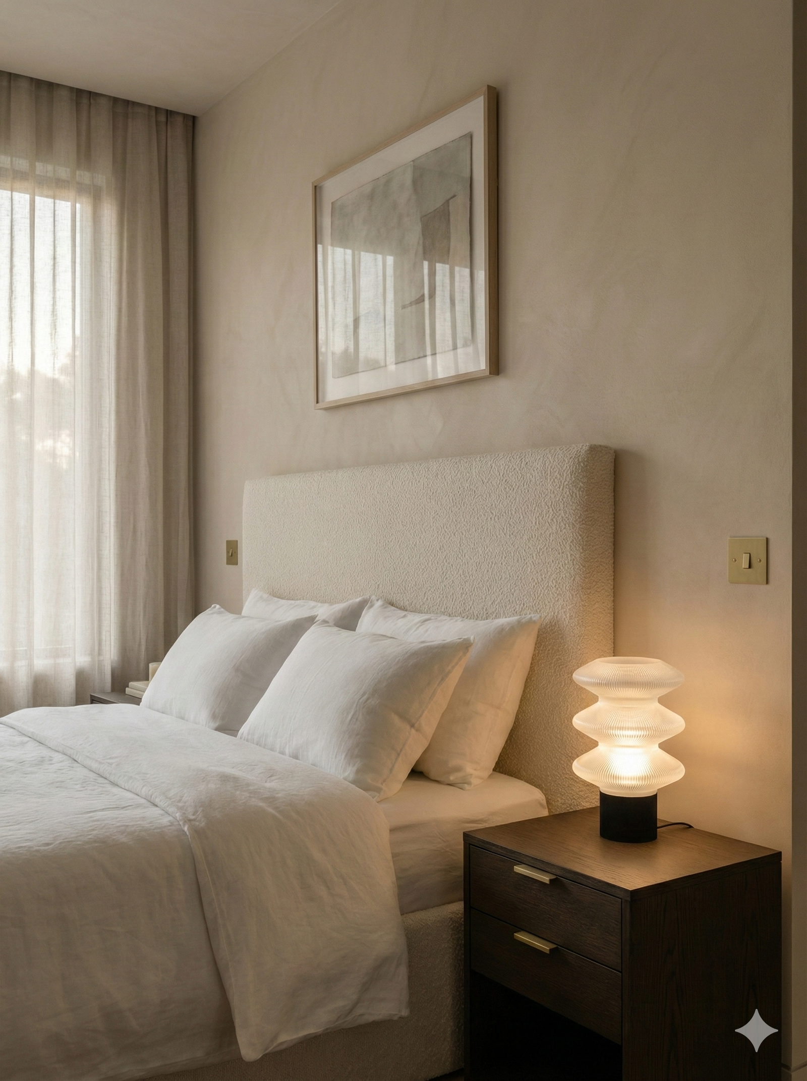 Inspired by rhythmic curves and organic contouring, the design explores sculptural geometry through a fluid, tiered silhouette. The clear white glows with a pure, diffused light that feels weightless and serene — creating a mood that is calm, airy, and quietly restorative, bringing a sense of clarity and effortless elegance to the space.