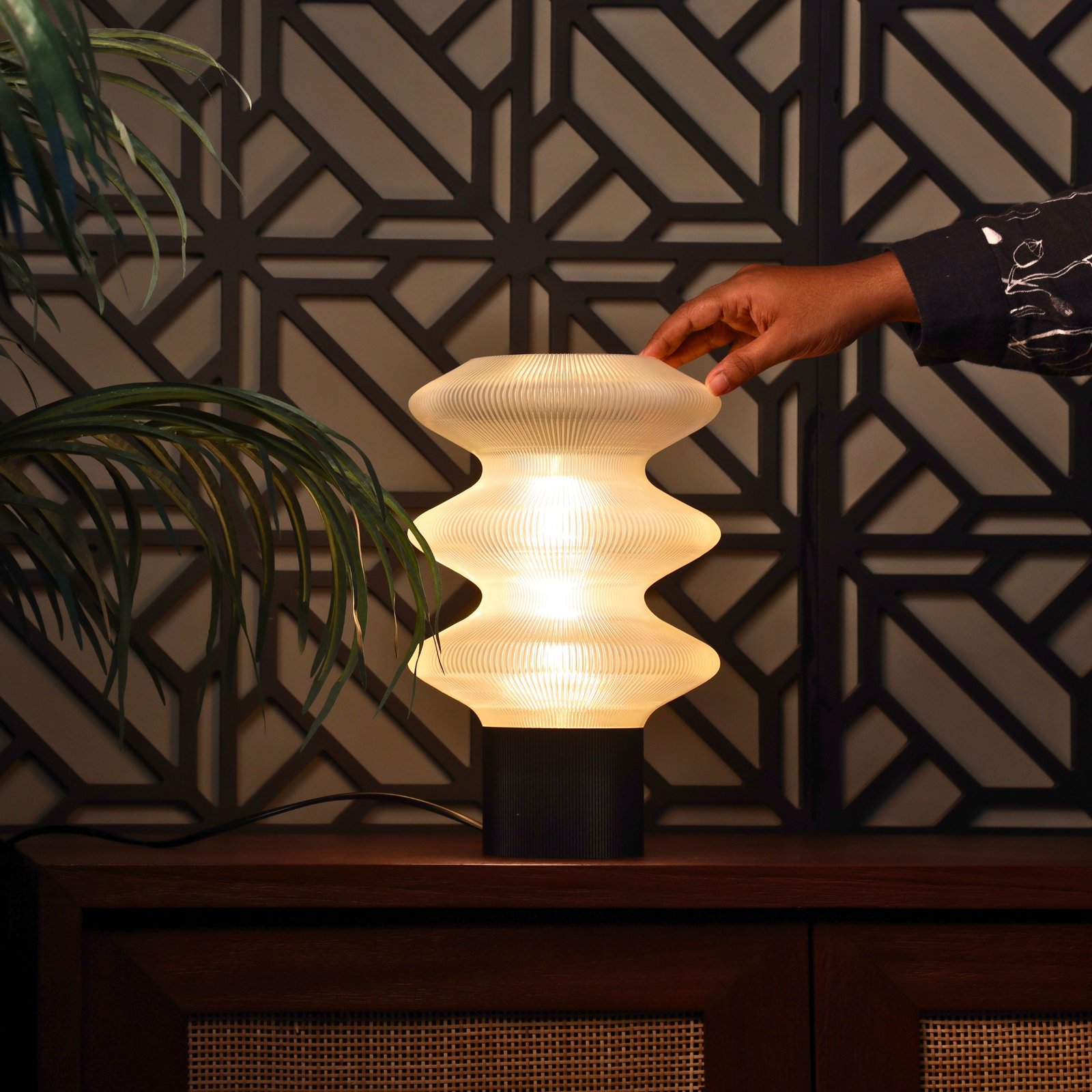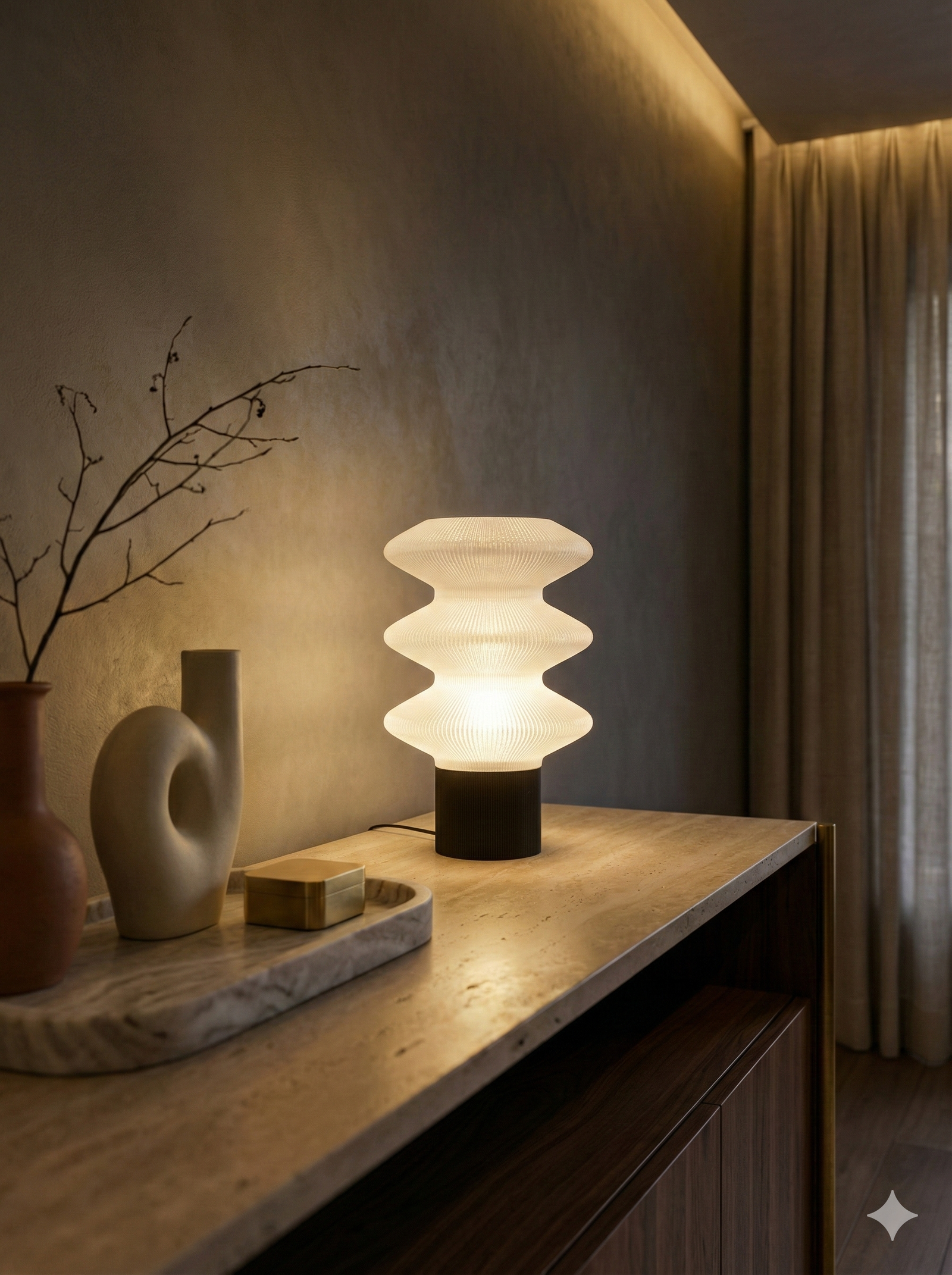 3D printed from eco-conscious, plant-based PLA, CURVA celebrates sustainable design without compromising on refinement. The clear white glows with a pure, diffused light that feels weightless and serene — creating a mood that is calm, airy, and quietly restorative, bringing a sense of clarity and effortless elegance to the space.