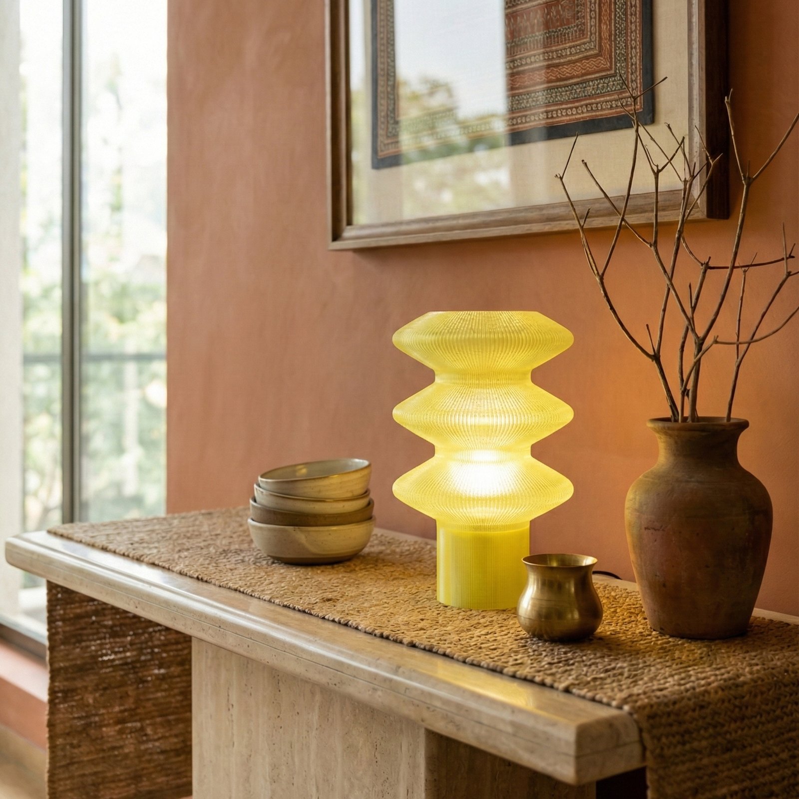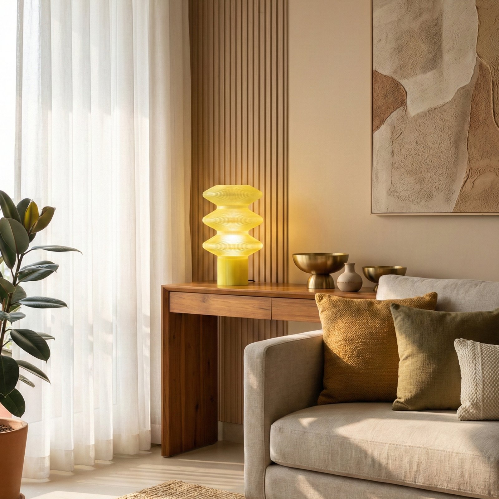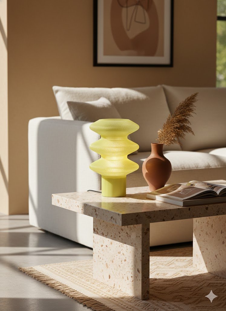 Inspired by rhythmic curves and organic contouring, the design explores sculptural geometry through a fluid, tiered silhouette. The yellow radiates a soft, sunlit warmth that instantly lifts the atmosphere — creating a mood that feels joyful, comforting, and effortlessly optimistic, like a gentle glow that brightens both the room and the spirit.
